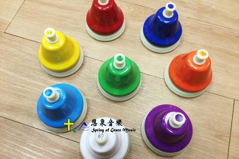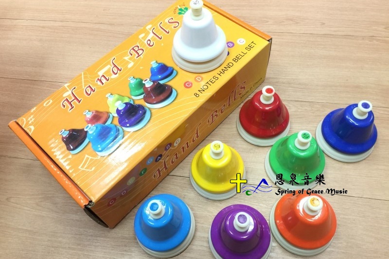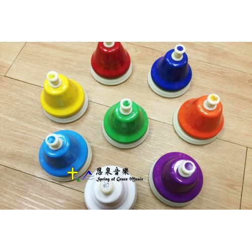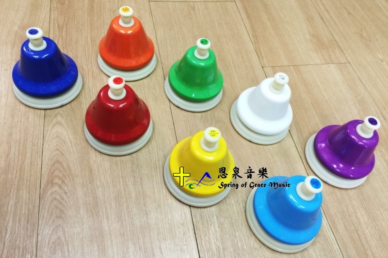 不同顏色的八色鐘,可按出八度音色。固定了的底座,讓人很容易和不費勁地輕輕按下去!