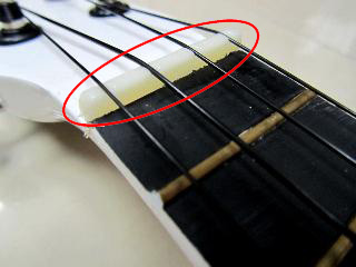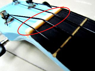 市面有平價如HK$100 至HK$200 左右 的初級型UKULELE, 很多朋友買後發覺音不太好聽, 其實是因為音不準, 左圖是有問題的UKULELE(跟我們的UKULELE 右圖比較), 圈起來的地方, 弦枕造得太高, 以至空弦之後所有格數音不準確,